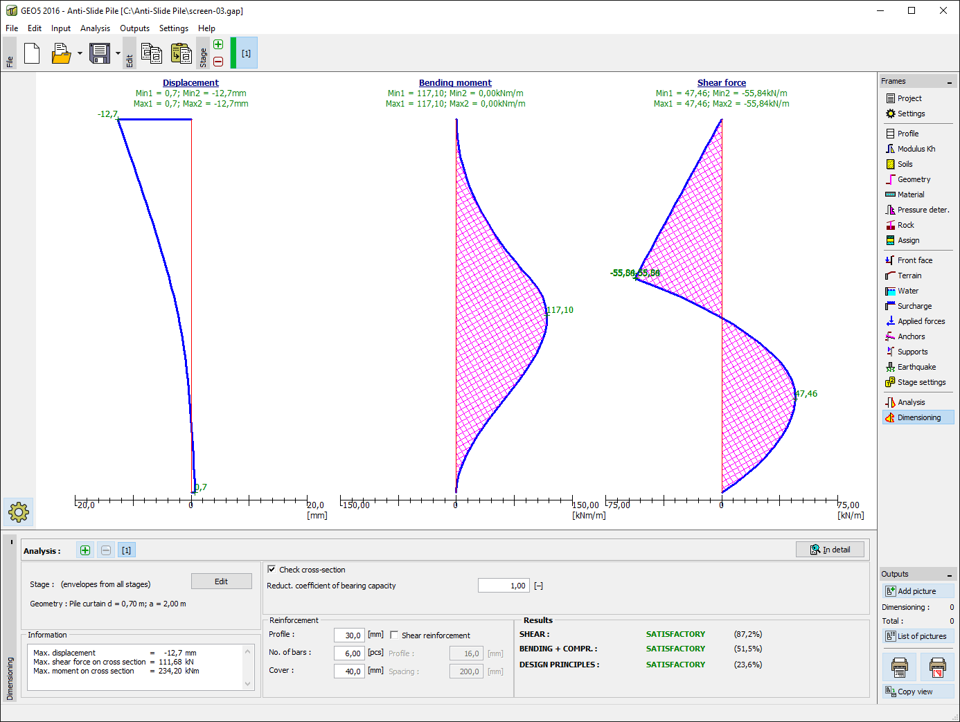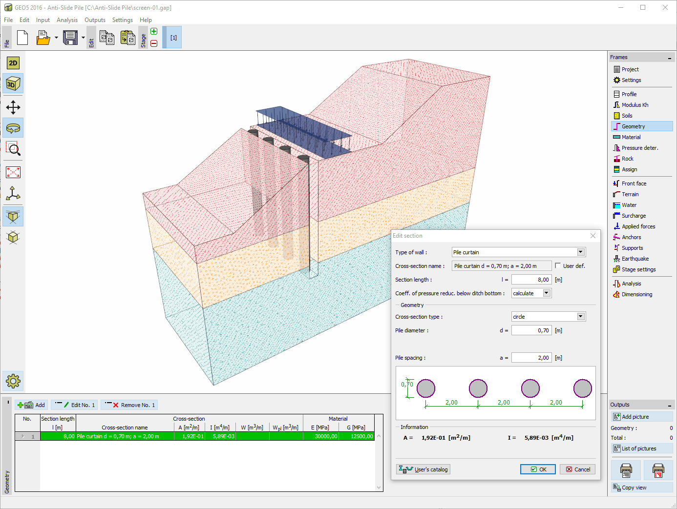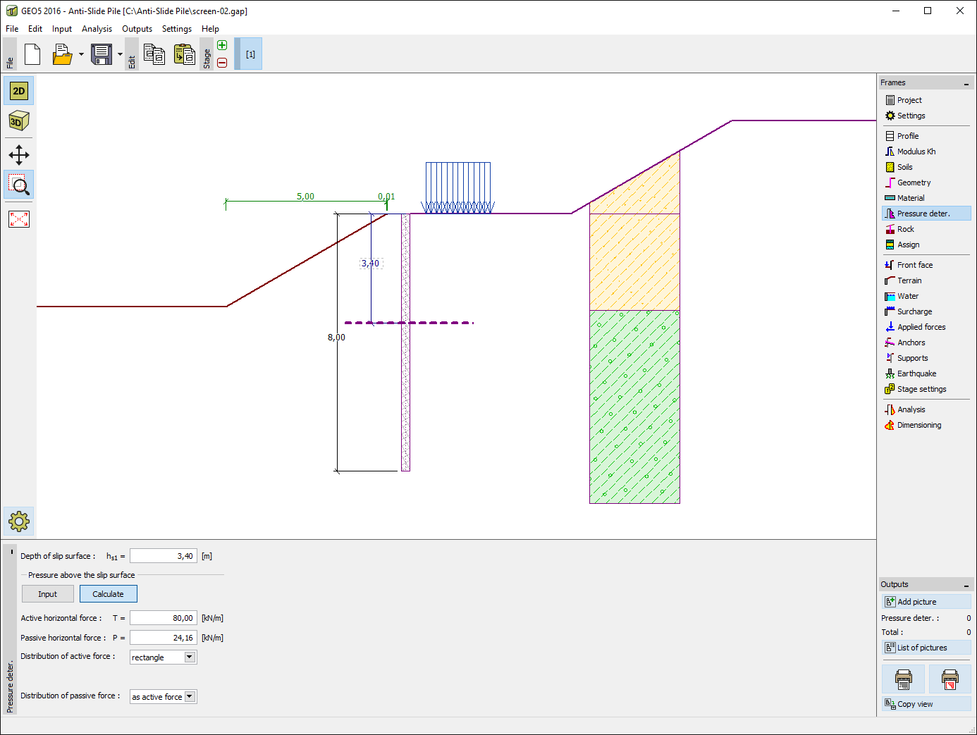 Program Dizajn pilota u klizištima se koristi za oblikovanje pilota i stabilizaciju klizne plohe ili povećanje faktora sigurnosti nagiba. Prva analiza treba biti učinjeno programu Stabilnost kosina, u kojom se izračunavaju elemente aktivnih i pasivnih sila, koje djeluju na pilotni zid. Zatim položaj opterećenja i klizanja prenesemo u program Dizajn pilota u klizištima, gdje se obavlja druge analize (određivanje unutarnjih sila na pilot, deformacije pilota i dimenzioniranje armature pilota).